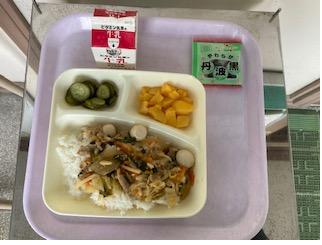 本日の給食の献立は、 中華丼 きゅうりのピり辛あえ ソフト黒豆 黄桃 牛乳 です。