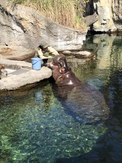 天王寺動物園はカバ舎前がチェックポイントになっています。自然史博物館では、外で昼食をとりました。