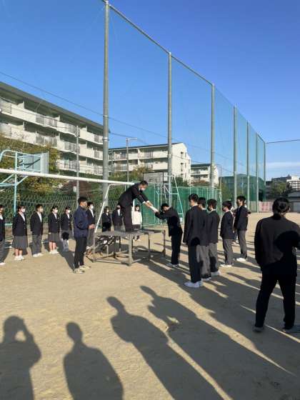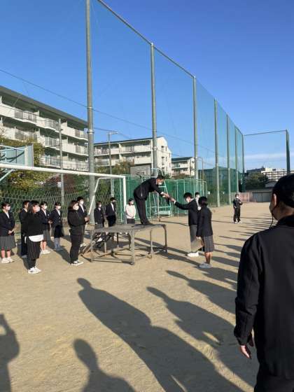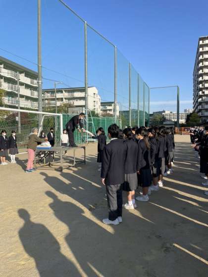 22日(火)の朝、先週から始まった防球ネットの改修工事にともない、並び方を変更して《全校集会》を行いました。