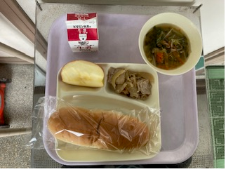 豚肉のオイスターソース焼き 中華みそスープ りんご