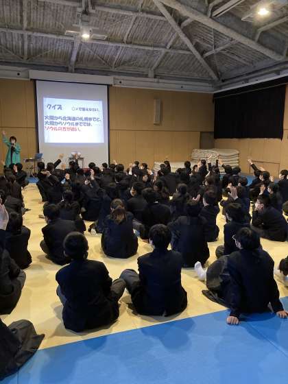12月2日(金)午後、1年生では多文化理解学習として、韓国・朝鮮の文化を学習しました。格技室では本校国際クラブの高己蓮ソンセンニム(先生)の講話を伺いました。
