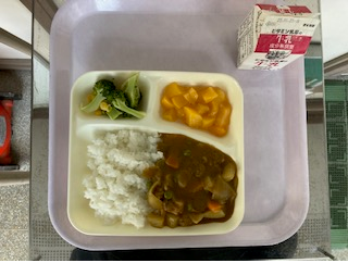 冬野菜のカレーライス ブロッコリーとコーンのサラダ 黄桃 牛乳
