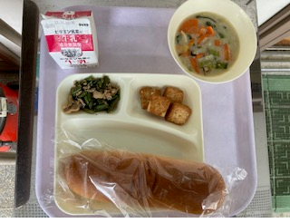 はくさいのクリーム煮 あつあげのごまじょうゆかけ 豚肉とさんどまめのオイスターソースいため 黒糖パン 牛乳