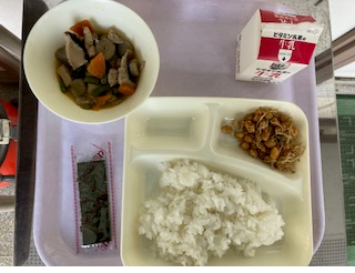 本日の給食の献立は、 筑前煮 じゃこ豆 焼のり ごはん 牛乳 です。