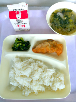 本日の給食の献立は、 たらフライ すまし汁 こまつなのごまあえ ごはん 牛乳 でした。