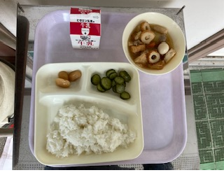 本日の給食の献立は、 関東煮 きゅうりの梅風味 白花豆の煮もの ごはん 牛乳 です。