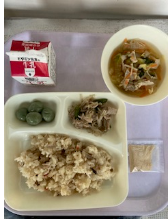 かやくごはん 豚肉と野菜のいためもの すまし汁 きな粉よもぎだんご 牛乳
