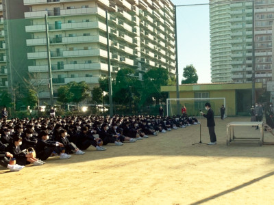 穏やかな晴天のもと、1〜3年生全員が集う最後の集会となりました。