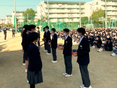 6日(月)、全校集会に続いてグラウンドで《3年生を送る会》が行われました。生徒会執行部をはじめ、1,2年委員長会が協力して進行しました。