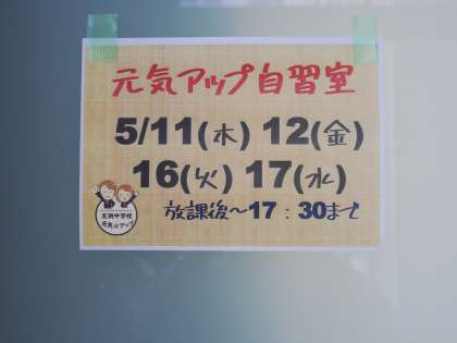 友渕中の生徒の皆さん、明日から中間テストです。今日は、食事睡眠を十分にとり、体調を整えてテストに臨んでください。