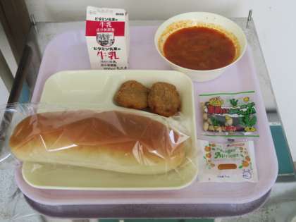 今日の給食では鶏肉とキャベツ、たまねぎ、トマトなどの野菜が使われています。トマトの酸味と野菜の甘みがスープに溶け込み、まろやかな味となっています。