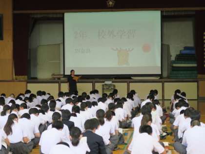 1年生と同様に、忘れ物が無いよう今日のうちに確認をしておきましょう。明日の朝は8時集合です。今日は早く寝ましょう。明日の朝は、朝食をしっかりと食べて集合時刻に遅れずにきましょう。