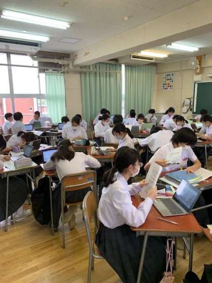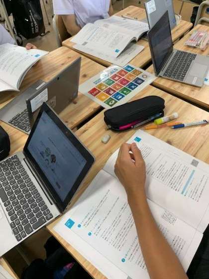 6時間、2年生はキャリア教育の続きに取り組みました。企業ごとの課題について調べ、発表に向けての資料づくりを行いました。