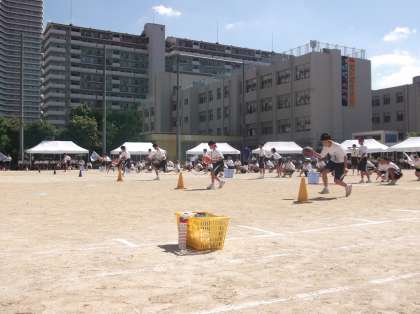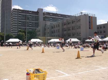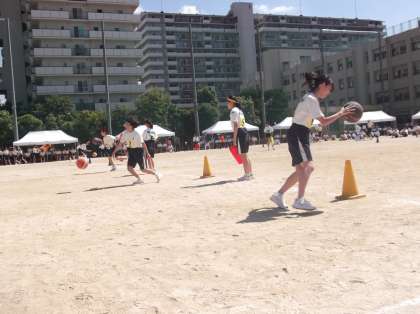 バスケットボールリレーの様子です。ドリブルをしながら、3つのコーンを回り、4人でリレーを行いました。
