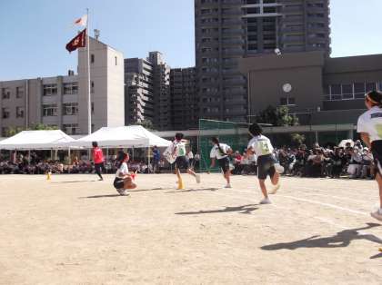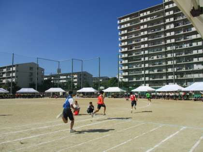 午後のプログラムは、色団別リレーです。各学年男女1名ずつ縦割りのリレーです。アンカーの3年生男子は、1周走ります。