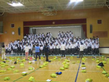 一学年が合唱しているときは、他の学年は体育観の中で鑑賞します。