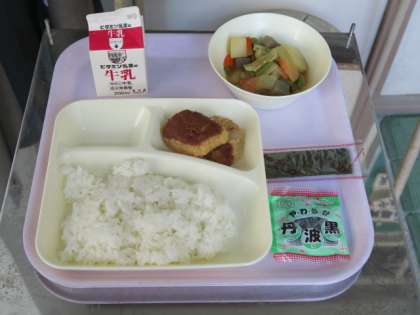今日の献立は、みそカツ、じゃがいもと野菜の煮もの、焼きのり、ソフト黒豆です。