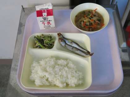 今日の献立は、焼きししゃも、みそ汁、小松菜の炒めものです。
