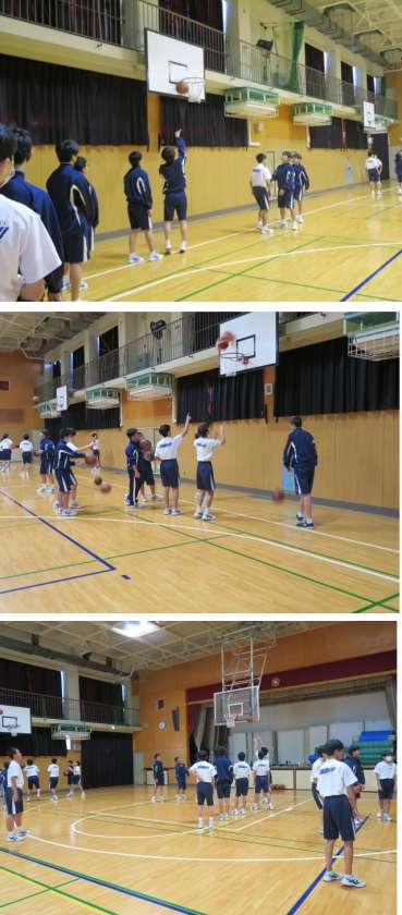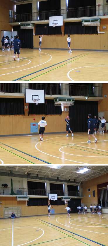 シュート練習後は、2つの班でバスケットゴールに入った数を競い合うゲームを行いました。中々ゴールに入れるのが難しいですね。ちなみにゴールには、バスケットボール約2個入るそうですよ。狭いようで割と大きいです。