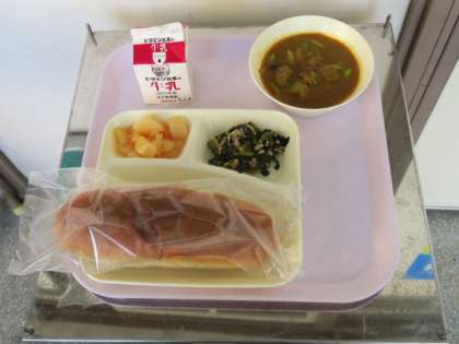 今日の献立は、ミートボールと野菜のカレー煮、ツナと小松菜のソテー、白桃です。