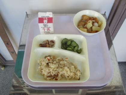 今日の献立は、かやくご飯、関東煮、きゅうりの梅風味、とら豆の煮ものです。