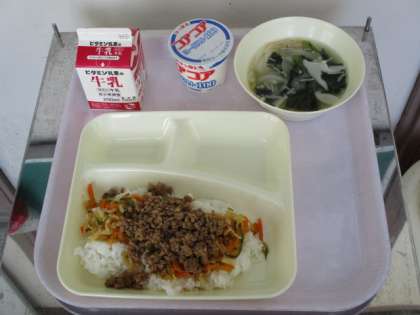今日の給食のビビンバの具はコチジャンで味付けしたひき肉ときゅうり、にんじん、切干しだいこん使ったナムルです。