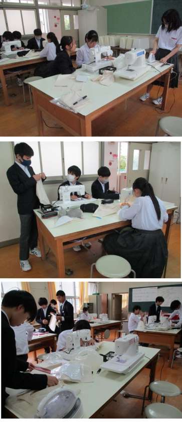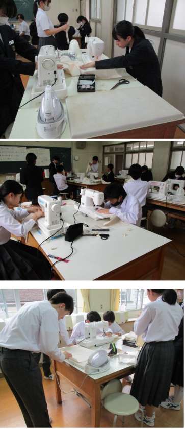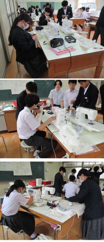 ミシンを使っての縫い付けは、どの生徒も慎重に怪我をしないように行っていました。