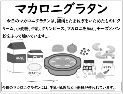 今日の献立は、マカロニグラタン、キャベツのスープ、みかんです。