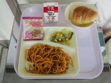 今日の献立は、ミートソーススパゲッティ、レタスとコーンのサラダ、いもけんぴフィッシュです。