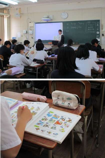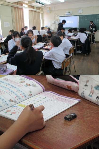 テープからの発音を聞き取り、教科書のイラストとスペルトの確認をしていました。