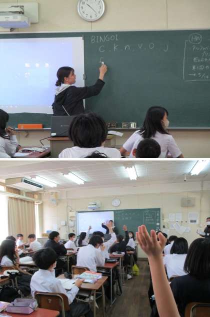 また、生徒たちは、マス目に英語の頭文字を記入し、先生が英語で単語を発音した頭文字がマス目にあればチェックしていきます。ビンゴゲームのように、縦、横、斜めがそろえばOKです。楽しみながら、英語の聞き取りや発音を確認していました。