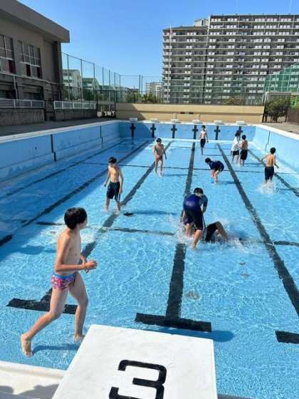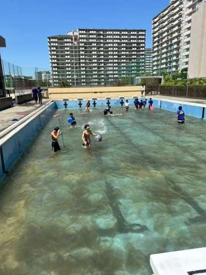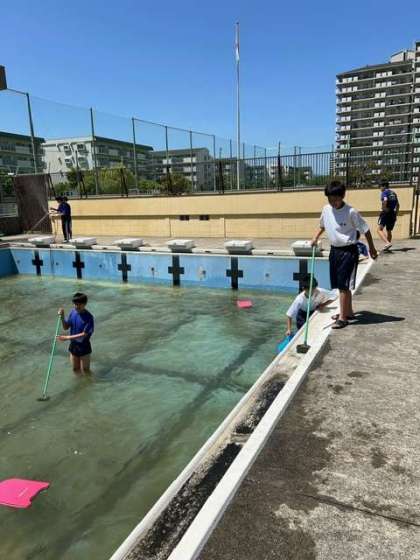 水泳部は土曜授業が終わってからの午後、プール掃除を行いました。落ち葉や砂、泥などたくさん汚れが溜まっていましたが、部員全員で協力をして、2時間でピカピカに仕上げました。その後は綺麗になったプールで少し遊びました。