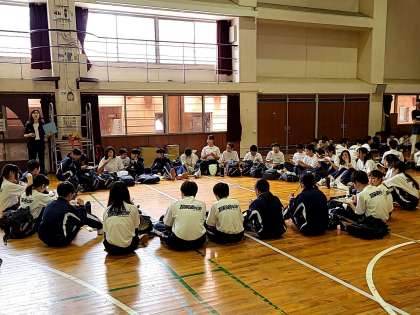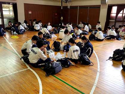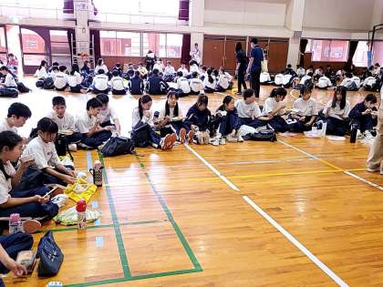 雨はやんでいますが、体育館でクラスに分かれて昼食です。