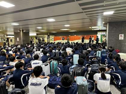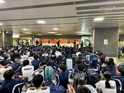 出発式では校長先生のあいさつ、修学旅行委員長のあいさつ、旅行中の諸注意、添乗員・カメラマンの紹介が行われました。