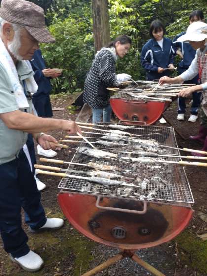 スタッフの方が竹竿に針やおもりをつけるところから教えてくださいました。 釣ったヤマメを自分で串に刺して塩焼きでいただきました。