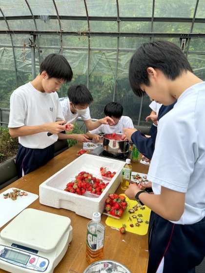 いちごの収穫体験をした班では、収穫したいちごを使っていちごジャムを作りました。