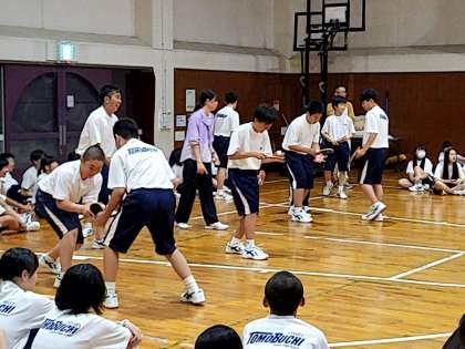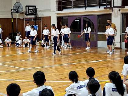 卓球ラケットにピン球をのせて運ぶリレーです。