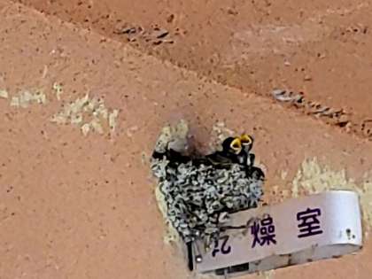 少年自然の家、入り口の壁の他、雨よけ出きる壁にツバメの巣があります。