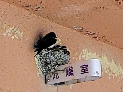 少年自然の家、入り口の壁の他、雨よけ出きる壁にツバメの巣があります。