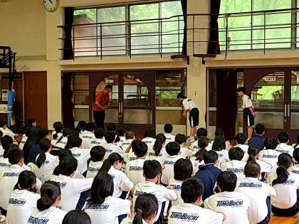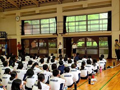 退所式は集いの広場で行う予定でしたが、雨が降っていて、次に宿泊する中学校がきています。体育館を使用しますので、ドッジボール大会の後、退所式を行いました。