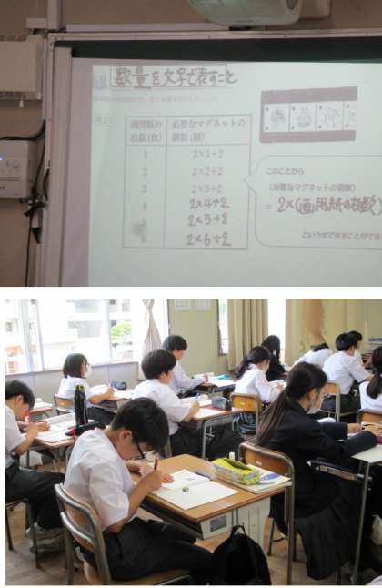 1年生の数学科で数量を文字で表すこと、文字式の表し方の授業を行っていました。