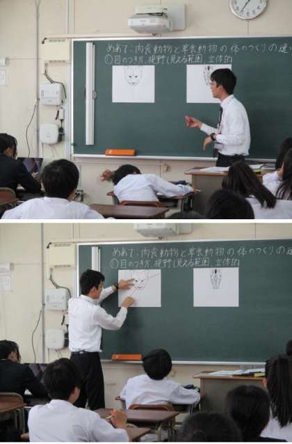 単元「動物の特徴と分類」の授業です。肉食動物と草食動物の体のつくりの違いを学びました。