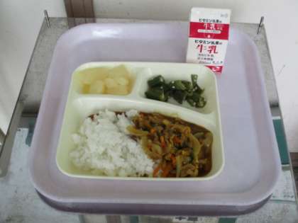 今日の献立は、和風カレー丼、オクラのかつお梅風味、和なしです。