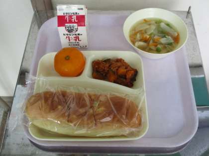 今日の献立は、さかぼちゃのミートグラタン、鶏肉と野菜のスープ、みかんです。