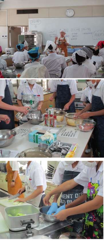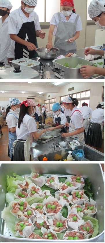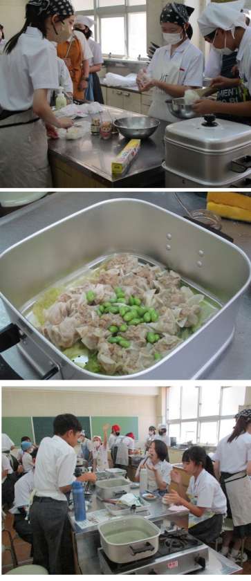 2年家庭科の調理実習で「しゅうまいとおにぎり」を作っていました。