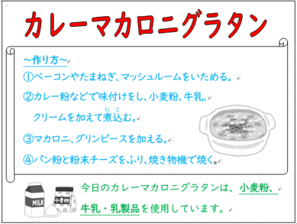 今日の献立は、カレーマカロニグラタン、トマトスープ、みかんです。