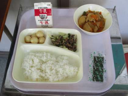 今日の献立は、一口がんもと里芋のみそ煮、牛肉と野菜のいためもの、みたらしだんご、焼きのりです。