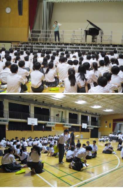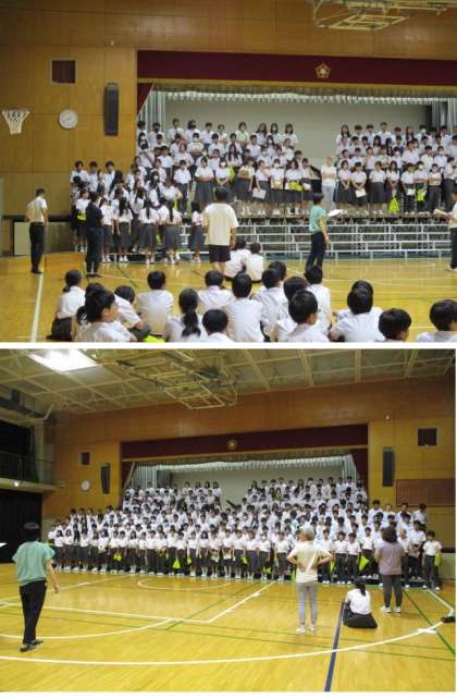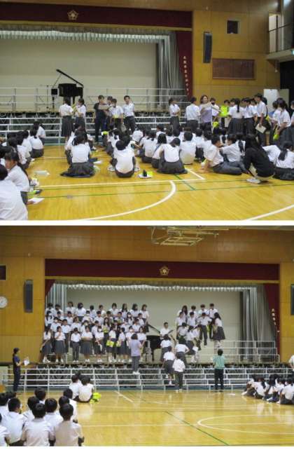 今日は、体育館で各学年とも合唱の練習を行いました。本校では、体育館のフロアー、舞台にひな壇を設置し学年全体で合唱を行います。