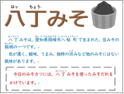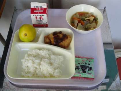 今日の献立は、みそカツ、じゃがいもと野菜の煮もの、みかん、ソフト黒豆です。