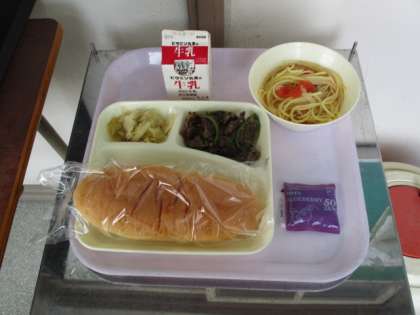 今日の献立は、牛肉の香味焼き、トマトのスープスパゲッティ、キャベツのサワーソテーです。